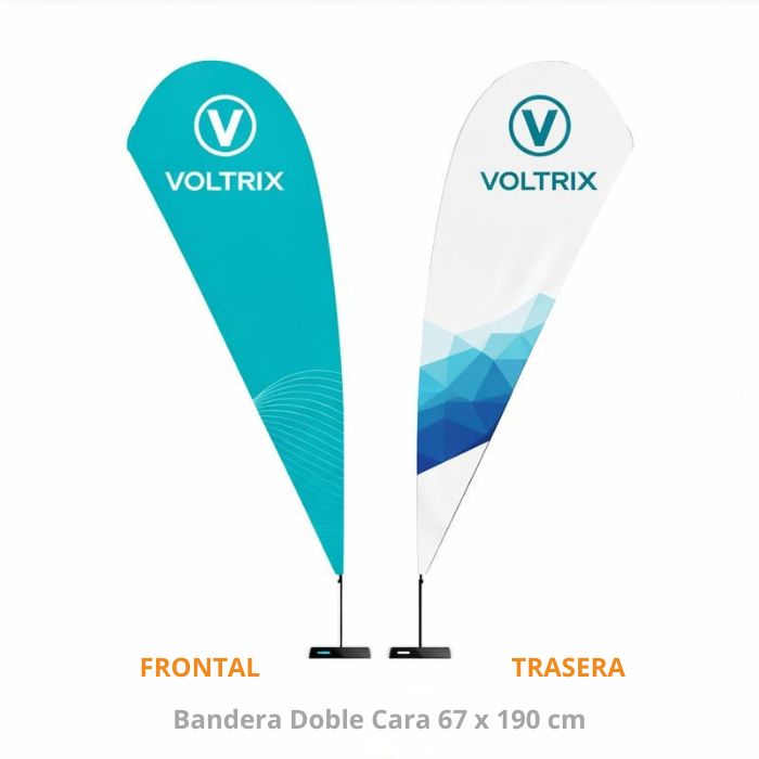 Sí. Disponemos de una bandera Gota de 67 x 190 cm de altura que permite impresión a dos caras con diseños diferentes en cada lado.