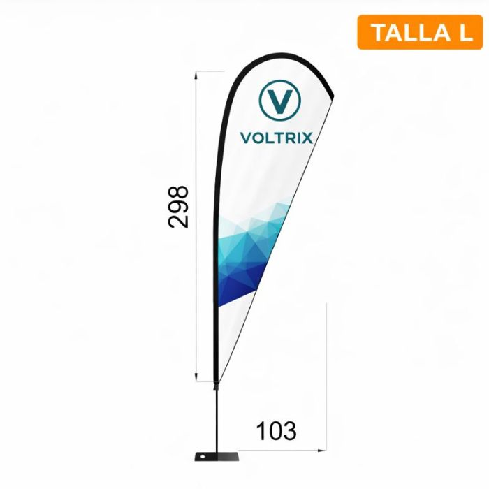 Las banderas gota personalizadas, también conocidas como fly banner gota o banderas lágrima, son ideales para eventos, ferias, promociones y acciones publicitarias en exterior. Su forma curvada aporta dinamismo y garantiza una gran visibilidad de tu marca.