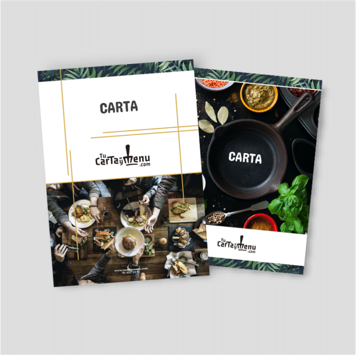 Es una solución sencilla y económica para las cartas y menús de tu restaurante, en papel estucado mate de 300 grs con gran calidad de impresión, pero cuidado porque al no estar protegido se deteriora antes. Te recomendamos esta opción para cartas y menús que no tengan que aguantar mucho tiempo expuestos.