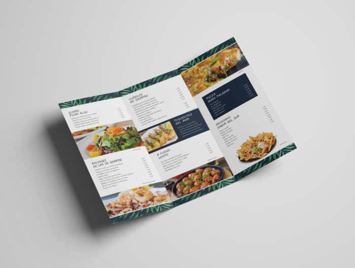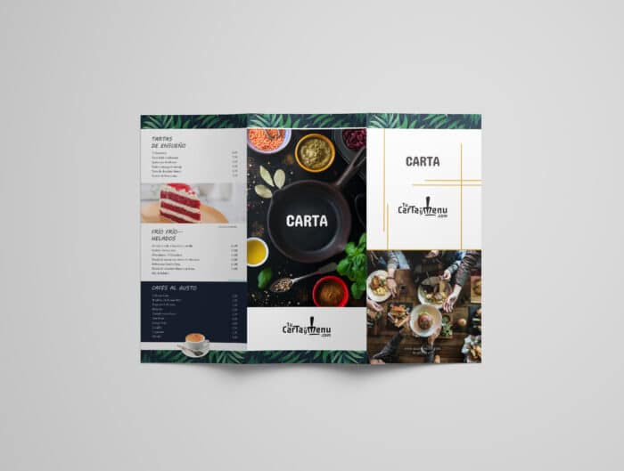 El formato tríptico, impreso por las dos caras, está recomendado para un menú de 40 a 100 platos, aunque con las herramientas que ponemos a tu disposición puedes incrementar el numero de platos.