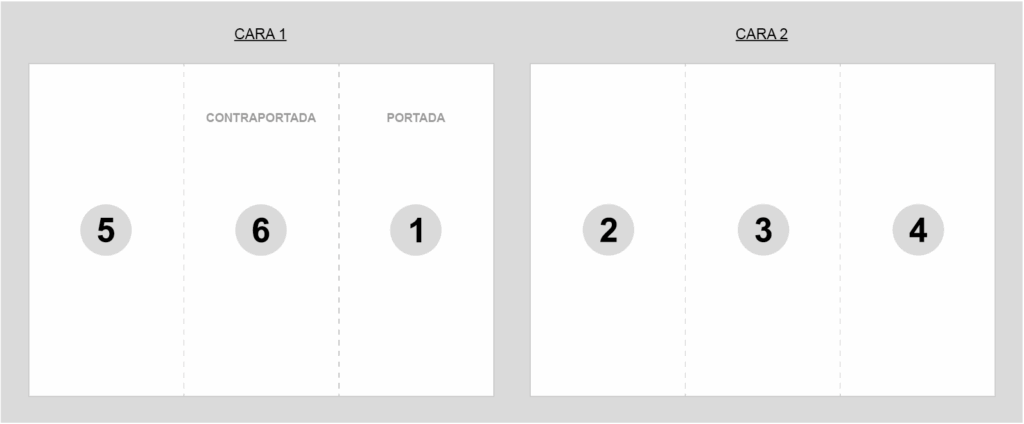El diseño del tríptico se realiza desplegado. En el diseñador encontraras 2 páginas, una por cada lado, con lineas punteadas que delimitan cada pala. Utiliza esta guía de plegado para diseñar correctamente tu tríptico.