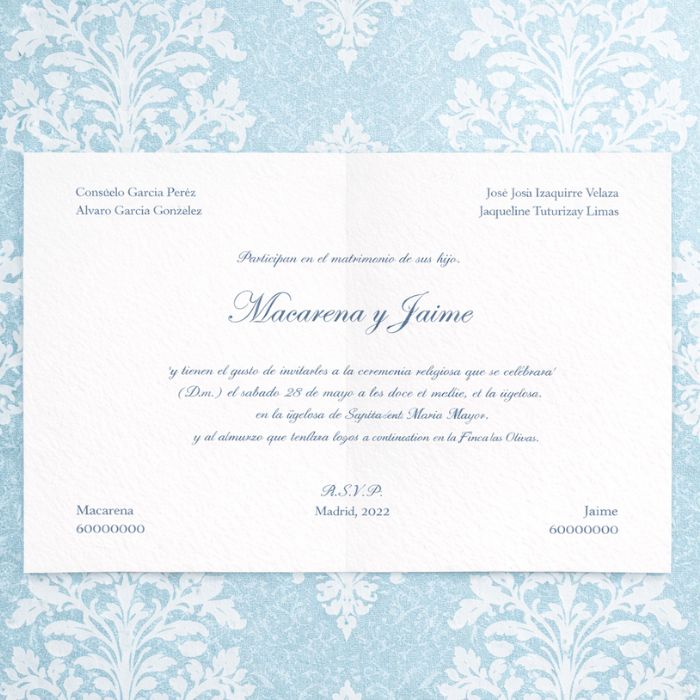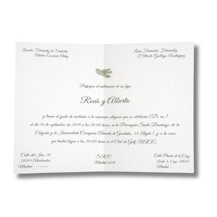 Nuestra invitación de boda clásica díptico A5 se presenta plegada, ofreciendo una composición equilibrada que permite organizar la información de forma clara y armoniosa.