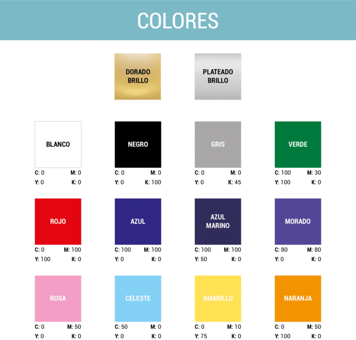 - Colores disponibles: dorado brillo, plateado brillo, blanco, negro, gris, verde, rojo, azul marino, morado, rosa, celeste, amarillo, naranja y otros bajo pedido.