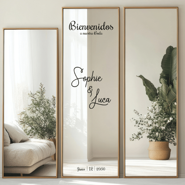 También puedes optar por incluir únicamente el nombre de los novios y la fecha, o elegir frases personalizadas que reflejen vuestro estilo y hagan que cada detalle sea aún más especial. Además de decorar, estos espejos se convierten en un lugar perfecto para hacer fotos con los invitados, creando un recuerdo inolvidable del gran día.